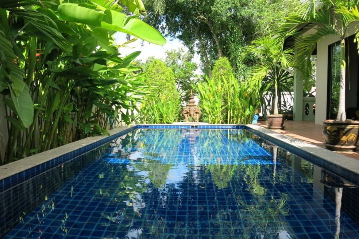 In the open-plan living and dining area, an antique-crafted wooden door frame from India separates the two. Sliding doors open to provide access to a private swimming pool. The U-shaped Western-style kitchen comes fully fitted with built-in storage cupboards and granite work surfaces. There is also a utility area at the rear of the house.