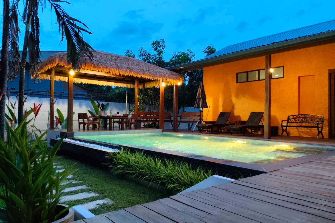 This house is a new built and has 2 buildings, the main house comes with 2 bedrooms with it own en-suite bathroom, 1 shared guest bathroom, living and open dining area with a Western Style Kitchen, there are sliding door to access to the pool and the house has designed as an “L” shape. It offers natural light and airy. To the pool deck – there is a Sala with Bali Style, a BBQ area and a wooden hut with has pantry and suitable to entertain company. The pool size is 4×7 meter. There is some garden space on the side and the rear of the house.