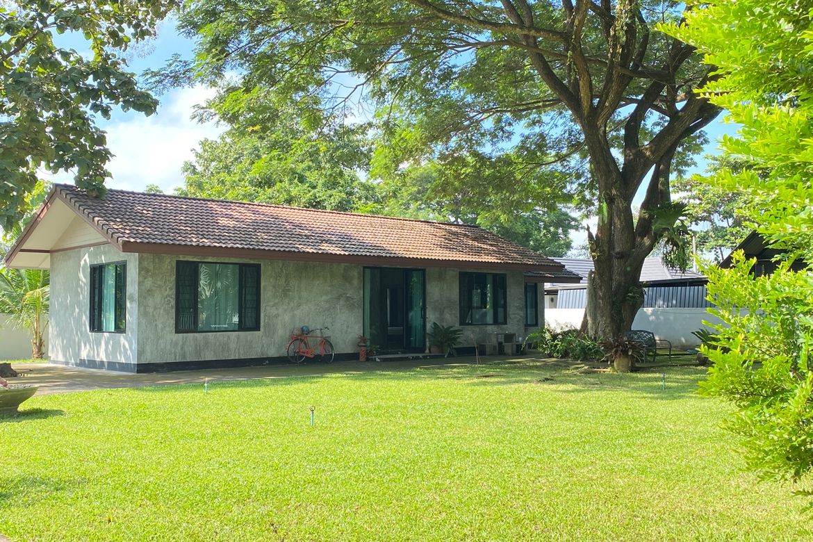 The house sits on over one rai of large lawn land with some mature trees, all fenced in and has a long cemented driveway from the gate. Inside, it is a modern loft style with polished cement walls and tile flooring. Floor to ceiling glass doors provide good natural lights as well as great views of the garden. There is a long open living area, a guest bathroom with shower, 2 bedrooms with beds and ac and another room that can be either a third bedroom or an office or storage etc. A Thai style kitchen and another bathroom are at the rear of the house with large door access to the garden. The house is easy to maintain and also is available for rent for commercial purposes such as a restaurant or a cafe. Price can be discussed for this purpose.