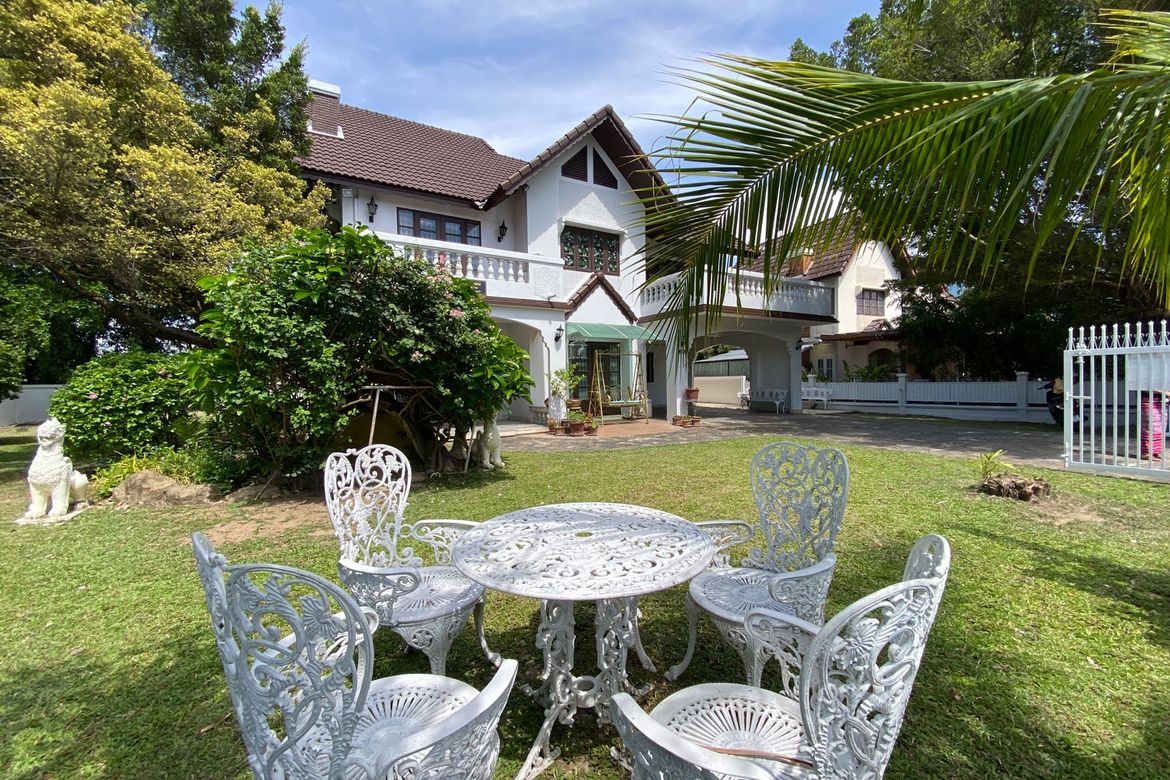 This 2 storey house is spacious, has a large garden consisting of manicured lawn, shrubs and trees with driveway from the gate leading to a covered carport. The living room is spacious, has 2 sitting areas with all marble flooring keeping the house cool, ceiling wood beams, working fireplace, built-in bar and wall units. There is a study room, storage room and dining area with a large built-in pantry with ample cupboard spaces. A glass door separates the entry to the guest bathroom and through to the Thai kitchens, one smaller and one larger one. At the rear is the maids room and bathroom with access to the garden.