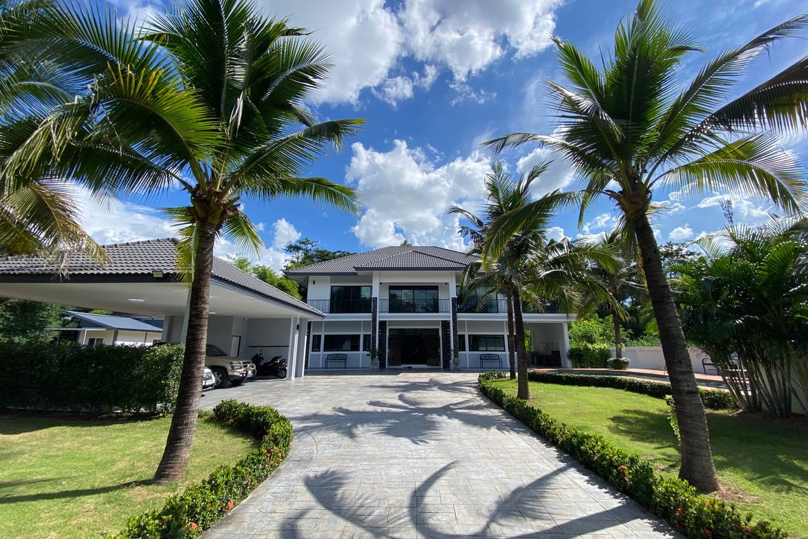 The property sits on over 1 rai of nice square-shaped land with front and back gardens. From the automated gate, there is a wide driveway to the covered carport and storage room, lawn on the left and swimming pool with deck area on the right. Inside there is a tall ceiling hallway with a grand staircase and chandelier. On the right side are a fully fitted Western kitchen with a breakfast & cooking island and door access to the Thai kitchen and outdoor dining area. Next to the kitchen is the fitnessstudy room. On the left side is the sitting area with a comfortable sofa set and a guest bedroom with a matching bed and a built-in closet and an ensuite with a jacuzzi. All rooms are equipped with cassette air conditioning units.