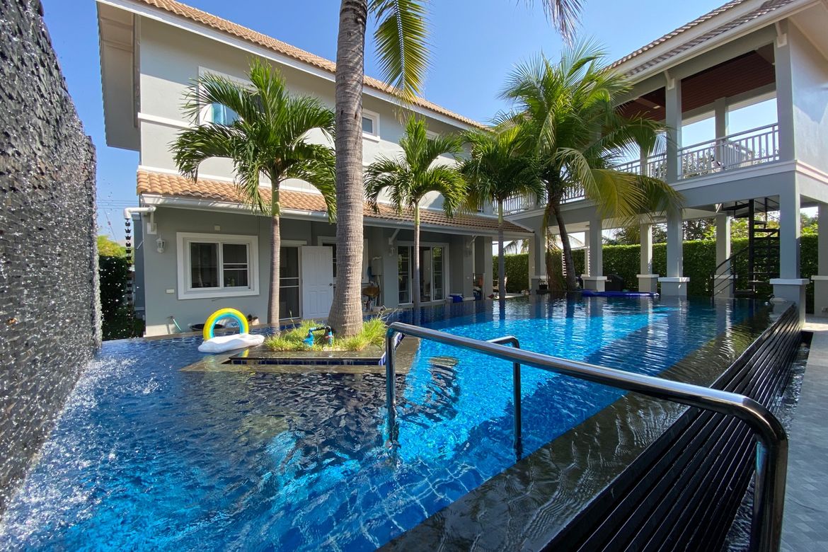 The annex building is connected by a covered walkway or winding staircase from the master bedroom’s terrace. It is one storey with folding doors, a large poolside terrace & deck, a living room in the center, a study and Western kitchen with a built-in dishwasher on the left, and an ensuite bathroom on the right. The house is tastefully decorated and uses high-quality fittings and fixtures. The garden is of beautiful lawns, hedges, and tropical plants. The estate facilities include a common green area, playground, fitness, swimming pool, a clinic, and 24hr security.