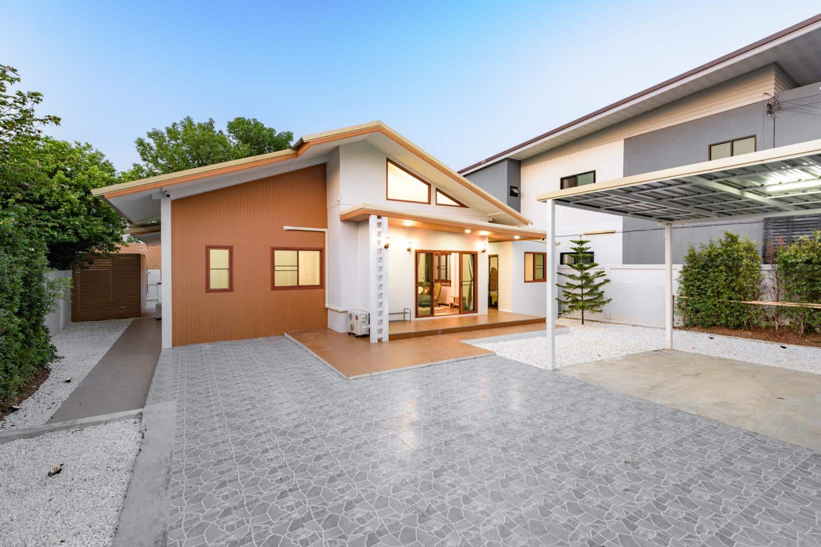 4-bedroom with vaulted ceilings, stylish interior, and fenced yard along small canal in Mae Rim. Located in a Thai village, the house is a cute, modern take on Japanese stylings with attractive design touches not often seen in Chiang Mia. These include a vaulted ceiling with rafter windows, skylights, arched doorways, and contemporary furniture. The living room is right off the main entrance which branches into the dining room and kitchen area. The kitchen is small but is well equipped and has a cute counter bar. The two guest bedrooms and guest bathroom are off the dining area. The master bedroom has a separate entrance off the living room and has a walk-in closet, and ensuite bathroom.