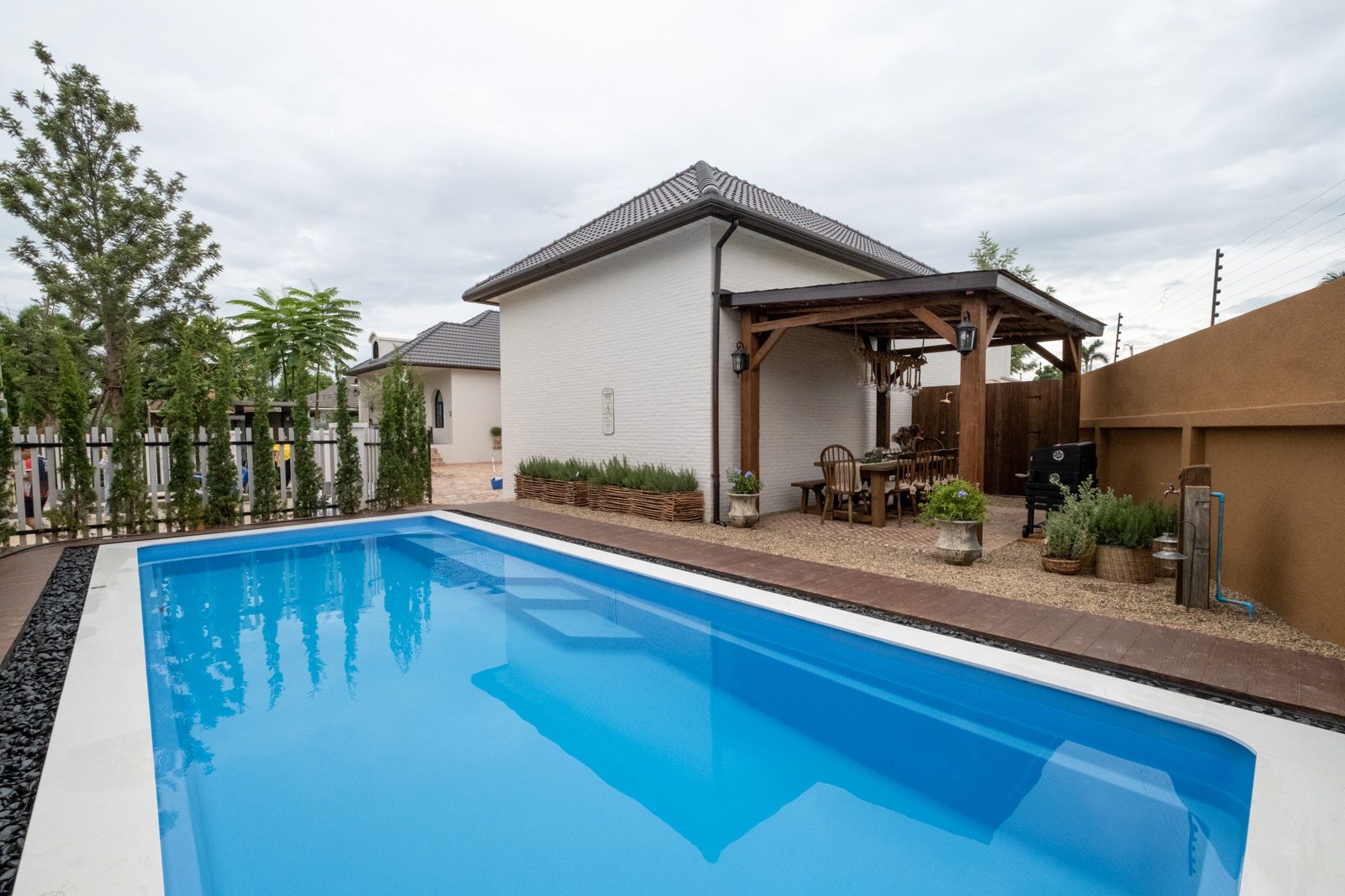 Only 15 minutes to town, this newly constructed 3-bedroom residence offers a harmonious blend of luxury country aesthetics. Boasting three spacious bedrooms, all with ensuite bathrooms, the home caters to both comfort and privacy. The heart of the house is the fully equipped Western kitchen, which seamlessly transitions into an expansive open-plan living room, accentuated by vaulted doorways and high, vaulted ceilings with exposed rafters, creating an atmosphere of grandeur and openness. Outside, the manicured garden provides a tranquil retreat and extends around the property, perfect for relaxation or entertaining guests by the covered patio or country style BBQ area. The property includes a generous fully enclosed garage with capacity for four vehicles, maid’s room with separate bathroom, and extensive Thai kitchen and laundry. Residents will benefit from excellent security and community facilities including a great gym and pool, all while being conveniently located nearby town, schools, shopping, and entertainment.
