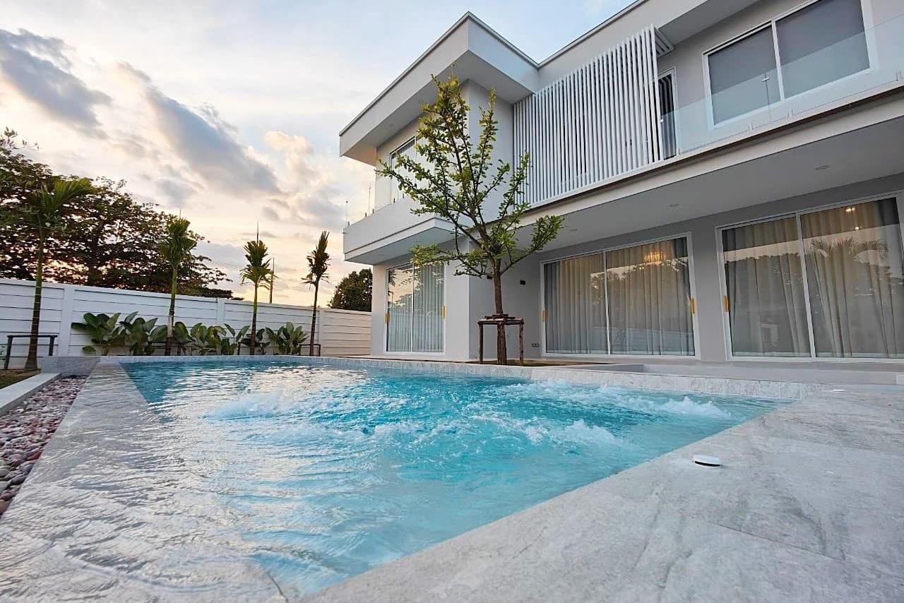 Stunning modern 6-bedroom luxury pool villa offers an exquisite blend of contemporary design and natural beauty. Set amidst a lush garden in a quiet village, the property boasts six bedrooms and seven bathrooms, providing ample space for comfortable living. The heart of the home features a spacious living room adorned with a plush sofa set and a built-in TV stand housing a large television. The open-concept kitchen seamlessly merges European and Thai styles, connecting to the dining area which showcases a striking marble dining table for eight. Fully furnished with high-quality materials, the villa exudes elegance and comfort throughout.