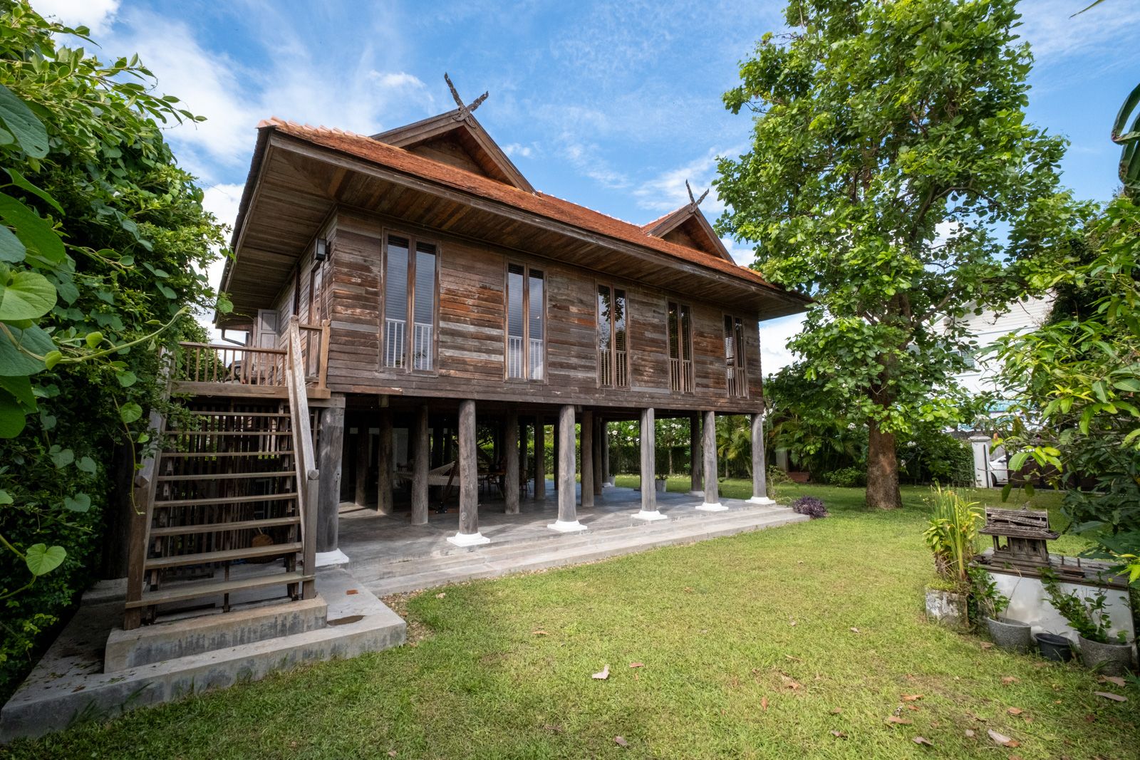 Modernized traditional Thai Teak wood house, offering a harmonious blend of heritage charm and contemporary comfort. This stunning property showcases authentic architectural details, including rich wood ceilings, exposed rafters, classic shutters, and majestic old-teak wood pillars. Modern upgrades include full air-conditioning, a modern bathroom, and a well-appointed western-style kitchen, ensuring a lifestyle of effortless luxury.